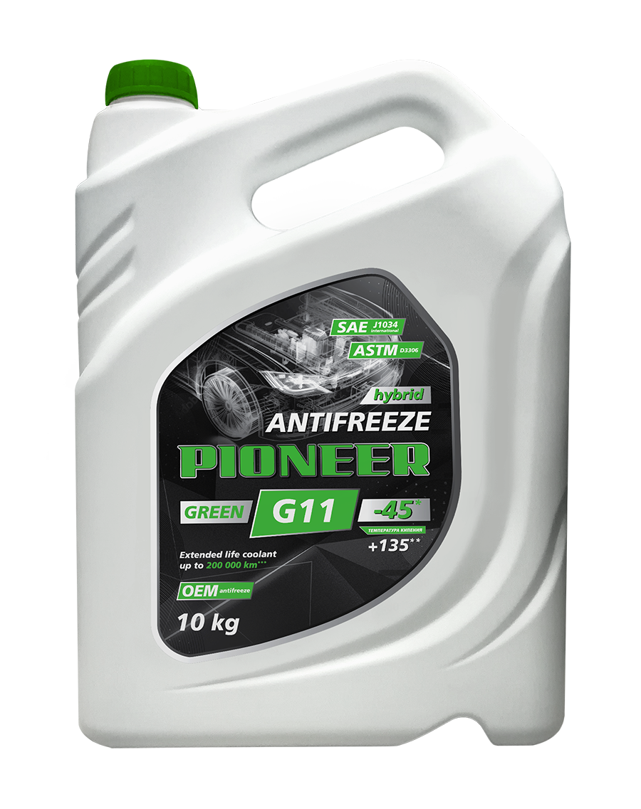 Антифриз «PIONEER GREEN-40» разработан с использованием запатентованного пакета присадок по гибридной неорганической технологии, на основе этиленгликоля. Обеспечивает надежную защиту металлов (алюминий, медь, латунь, сталь, чугун) от всех видов коррозии. Защищает систему охлаждения двигателя от замерзания и перегрева. Обеспечивает требуемый уровент теплового обмена. Не содержит аминов, фосфатов, боратов и нитратов.Гарантированно защищает систему охлаждения от замерзания (до –45°C*) и перегрева (до +135°C*)
