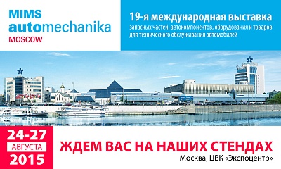 Приглашаем вас посетить 19-ю международную выставку запасных частей, автокомпонентов, оборудования и товаров для технического обслуживания автомобилей MIMS Automechanika Moscow, которая состоится с 24 по 27 августа 2015 г. в ЦВК «Экспоцентр» (Краснопресненская наб., д. 14, станция метро «Выставочная»)