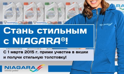 Как стать стильным с NIAGARA®? Легко! 1. Закупить весь ниже представленный ассортимент антифризов NIAGARA®: Код товара Наименование Количество к закупке 097391 Жидкость охлаждающая "Антифриз" "Ниагара" G11 (зеленый) 5 кг 2 шт 097514 Жидкость охлаждающая "Антифриз" "Ниагара" G11 (зеленый) 1 кг 3 шт 096836 Жидкость охлаждающая "Антифриз" "Ниагара" G12+ (карбоксилатный)(красный) 5 кг 2 шт 096903 Жидкость охлаждающая "Антифриз" "Ниагара" G12+ (карбоксилатный)(красный) 1 кг 3 шт 227537 Жидкость охлаждающая "Антифриз" "Ниагара" G11 (синий) 5 кг 2 шт 227535 Жидкость охлаждающая "Антифриз" "Ниагара" G11 (синий) 1 кг 3 шт 227018 Жидкость охлаждающая "Антифриз" "Ниагара" (универсальный)(совместим с G11 и G12) 5 кг 2 шт 227016 Жидкость охлаждающая "Антифриз" "Ниагара" (универсальный)(совместим с G11 и G12) 1 кг 3 шт 2. Сообщить торговому представителю интересующий размер толстовки. 3. Выложить товар на полке, оформить ее шелфтокером (предоставляется торговым представителем вместе с товаром). 4. Разместить в торговой точке рекламные материалы NIAGARA®: буклеты и плакат, которые предоставит торговый представитель. 5. Получить толстовку и сфотографироваться в ней на фоне продукта на фотоаппарат торгового представителя.* 6. Носить толстовку как можно чаще в магазине.