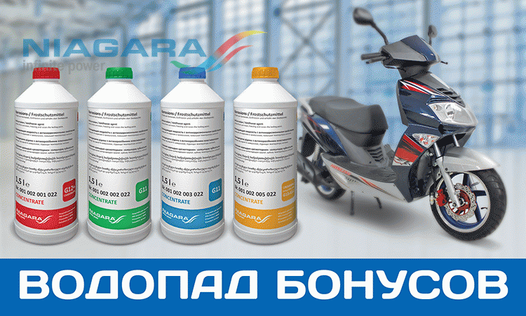 Купите девять флаконов концентрата антифриза NIAGARA 1,5 л (по три флакона трех разных видов из ассортимента Red, Green, Blue, Universal)и получите единовременный бонус* — 500 рублей.