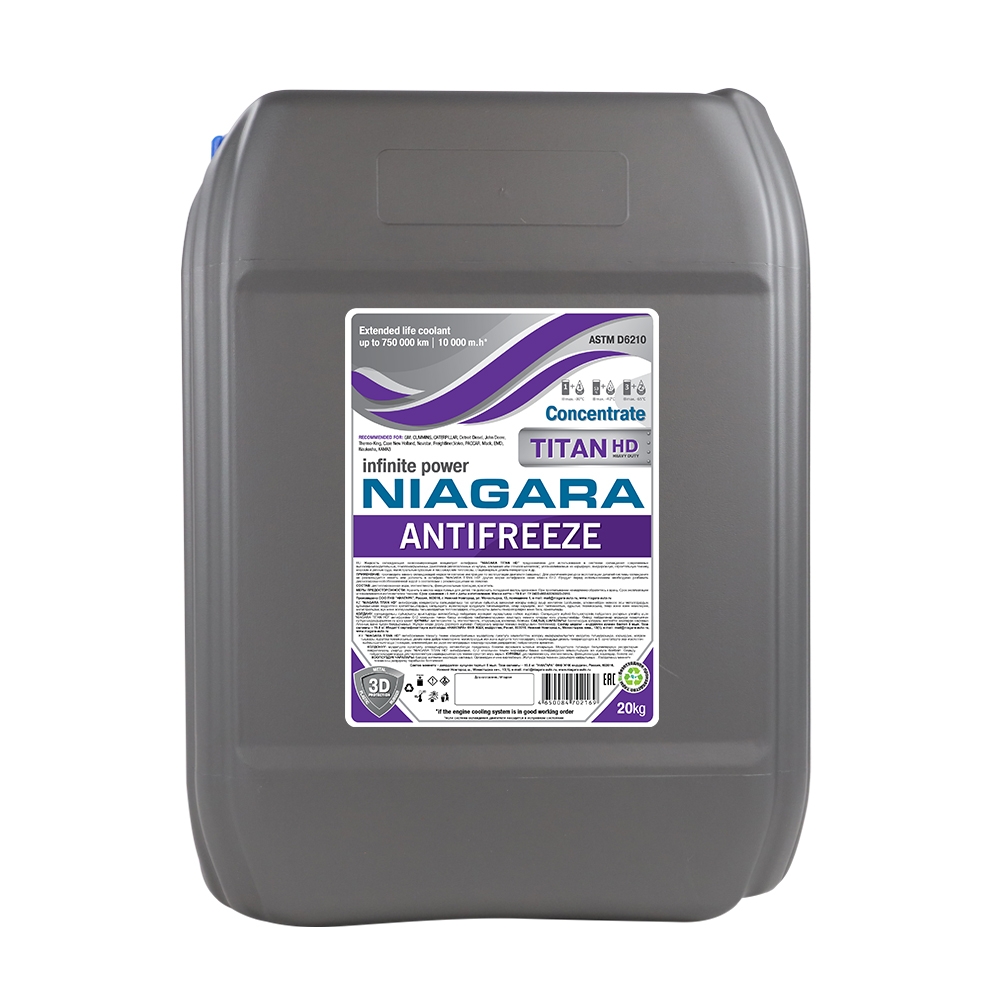 Охлаждающая жидкость (антифриз) премиум класса «NIAGARA® TITAN HD» предназначена для использования в системах охлаждения современных высокопроизводительных, тяжелонагруженных двигателей (изготовленных из чугуна, алюминия или сплавов металлов), устанавливаемых на крупнотоннажные магистральные тягачи Mercedes®, MAN®, Volvo®, Scania®, Iveco®, КАМАЗ® и т.п., карьерную, внедорожную, строительную технику, морские и речные суда, магистральные грузовые и пассажирские тепловозы, стационарные дизель-генераторы.